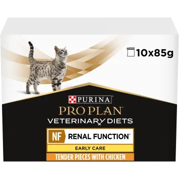PURINA PRO PLAN Veterinary Diets NF Early Renal Function Våtfoder Katt är ett komplett våtfoder till katter. Detta foder stödjer njurfunktionen vid tidigt stadium av kronisk njurinsufficiens hos vuxna katter genom måttliga mängder av högkvalitativt protein och begränsade nivåer av fosfor. Innehåller Omega 3-fettsyror, kalium och antioxidanter. Fodret ska alltid ges under tillsyn av veterinär. 10x85g.
