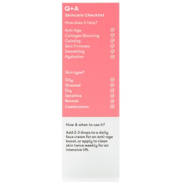 Q+A Collagen Booster Serum är ett återfuktande ansiktsserum med anti age-effekt. Hjälper till att stimulera cellförnyelsen i huden och förbättra dess smidighet och elasticitet. Berikat med veganskt kollagen som hjälper till att förbättra hudens fasthet och minskar intrycket av fina linjer, och algextrakt som återfuktar på djupet och gör att huden känns mer spänstig och fyllig. Serumet kan användas som en intensiv booster på egen hand eller blandas in i den dagliga fuktkrämen. Innehåller 99% naturliga ingredienser. Passar alla hudtyper Oparfymerad och vegansk formula. 15 ml.