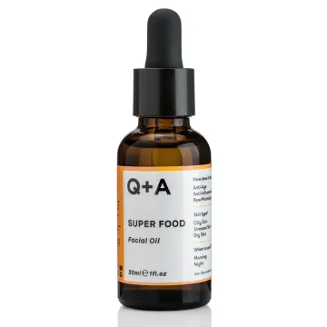 Q+A Super Food Facial Oil är ett uppstramande ansiktsserum. Serumet innehåller antioxidanter och essentiella fettsyror som jojobafröolja, oljor från bär och fikonkaktusfröolja. Serumet är även rikt på A-vitamin, C-vitamin, E-vitamin och F-vitamin. Parfymfri. 30 ml.