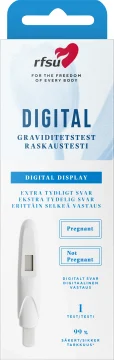 RFSU Digitalt Graviditetstest är ett lättanvänt digitalt graviditetstest som visar ett resultat inom tre minuter. Det har en bred spets som gör det lättare att kissa direkt på testet. Den digitala skärmen visar ett tydligt svar med texten “Yes” eller “No”. Du kan göra testet från och med den dag som du väntar din mens. Testets känslighet är 25 mlU/ml av hormonet hCG i urinen. Testet är över 99% tillförlitligt från och med dagen du väntar din mens. Du kan testa när som helst under dygnet men säkrast är att mäta morgonurinen, då hCG-koncentrationen är som högst.