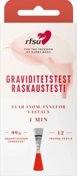 RFSU Graviditetstest Strips är enkla att använda hemma för att ta reda på om du är gravid och ger ett svar inom 1 minut vid test samma dag om du väntar din mens. Innehåller teststickor som doppas i behållare med urin och visar ett tydligt resultat med ett eller två streck. Testets känslighet är 25 mlU/ml av hormonet hCG i urinen. Du kan testa när som helst under dygnet men säkrast är att mäta morgonurinen, då hCG-koncentrationen är som högst. Testet är över 99% tillförlitligt från och med dagen du väntar din mens.