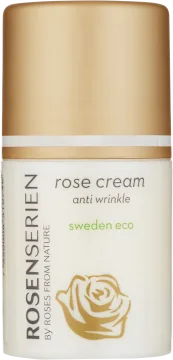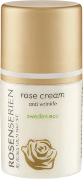 Rosenserien Rose Cream Anti Wrinkle är en intensivt fuktighetsbevarande och mjukgörande anti ageing-kräm. Med bland annat parakrasse, som har en dokumenterad effekt mot uppkomsten av linjer, hjälper rosenkrämen till att motverka de ålderstecken som uppstår på huden med åren. Krämen är också rik på antioxidanter och fettsyror från vegetabiliska oljor vilket fördröjer hudens åldrandeprocesser. Passar alla hudtyper och speciellt bra för normal till torr och/eller mogen hud. Basen består av ekologisk och rättvisemärkt Aloe Vera-gel vilket gör krämen dryg och extra återfuktande. Kombinerad dag- och nattkräm. Beroende på hudtyp kan Rose Cream Anti Wrinkle börja användas från ungefär 25-30 års ålder. Tillverkas i Sverige. 100% naturligt och veganskt innehåll. 50 ml.