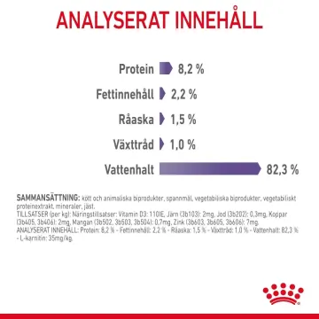 SAMMANSÄTTNING: kött och animaliska biprodukter, spannmål, vegetabiliska biprodukter, vegetabiliska proteinextrakt, mineraler, jäst. ANALYSERAT INNEHÅLL: Protein: 8,2 % - Fettinnehåll: 2,2 % - Råaska: 1,5 % - Växttråd: 1,0 % - Vattenhalt: 82,3 % - L-karnitin: 35mg/kg. TILLSATSER (per kg): Näringstillsatser: Vitamin D3: 110IE, Järn (3b103): 2mg, Jod (3b202): 0,3mg, Koppar (3b405, 3b406): 2mg, Mangan (3b502, 3b503, 3b504): 0,7mg, Zink (3b603, 3b605, 3b606): 7mg. UTFODRINGSANVISNING: se tabell. Partinummer, fabrikens registreringsnummer och bäst före datum: se förpackning. Förvaras svalt och torrt.