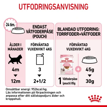 När din kattunge blir 12 månader kommer den att behöva ett foder som är speciellt anpassat för den vuxna kattens näringsbehov. Nu kan du byta till ROYAL CANIN®-serien för vuxna katter. I serien finns både torrfoder och våtfoder (patéer, bitar i sås och bitar i gelé).