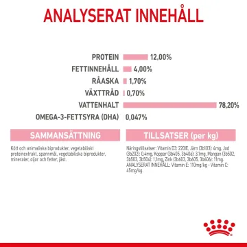 SAMMANSÄTTNING: kött och animaliska biprodukter, vegetabiliskt proteinextrakt, spannmål, vegetabiliska biprodukter, mineraler, oljor och fetter, jäst. ANALYSERAT INNEHÅLL: Protein: 12,0 % - Fettinnehåll: 4,0 % - Råaska: 1,7 % - Växttråd: 0,7 % - Vattenhalt: 78,2 % - Vitamin E: 110mg/kg - Vitamin C: 45mg/kg - Omega-3-fettsyra (DHA): 0,047 %. TILLSATSER (per kg): Näringstillsatser: Vitamin D3: 220IE, Järn (3b103): 4mg, Jod (3b202): 0,4mg, Koppar (3b405, 3b406): 3,1mg, Mangan (3b502, 3b503, 3b504): 1,1mg, Zink (3b603, 3b605, 3b606): 11mg. UTFODRINGSANVISNING: se tabell. Fabrikens registrerings- och partinummer, bäst före datum: se förpackning. Förvaras torrt och svalt.