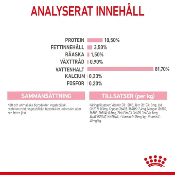 SAMMANSÄTTNING: kött och animaliska biprodukter, vegetabiliskt proteinextrakt, vegetabiliska biprodukter, mineraler, oljor och fetter, jäst. ANALYSERAT INNEHÅLL: Protein: 10,5 % - Fettinnehåll: 3,5 % - Råaska: 1,5 % - Växttråd: 0,9 % - Vattenhalt: 81,7 % - Kalcium: 0,23 % - Fosfor: 0,20 % - Vitamin E: 95mg/kg - Vitamin C: 40mg/kg. TILLSATSER (per kg): Näringstillsatser: Vitamin D3: 120IE, Järn (3b103): 3mg, Jod (3b202): 0,3mg, Koppar (3b405, 3b406): 2,4mg, Mangan (3b502, 3b503, 3b504): 0,8mg, Zink (3b603, 3b605, 3b606): 8mg. UTFODRINGSANVISNING: se tabell. Fabrikens registrerings- och partinummer, bäst före datum: se förpackning. Förvaras torrt och svalt.