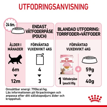 Royal Canin Kitten Sterilised Jelly är ett våtfoder framtaget för att tillgodose näringsbehovet hos kastrerade kattungar. Lämpligt för kastrerade kattungar i åldern 6 till 12 månader när de går igenom en period av viktiga fysiska och beteendemässiga förändringar. Det skräddarsydda våtfodret består av bitar i gelé som har en optimal storlek, konsistens och smak för växande kattungar. Det innehåller en måttlig mängd fett för att minska risken för övervikt, samtidigt som det innehåller optimala nivåer av protein, kalcium och fosfor för att stödja en hälsosam utveckling. Berikad med vitamin C och E som kan bidra till stärkt immunförsvar hos kattungen. Kombinationen av prebiotika och lättsmälta proteiner bidrar till en hälsosam balans i tarmfloran och god matsmältning. 12x85 g.