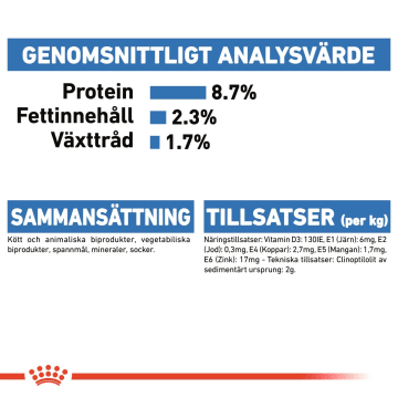SAMMANSÄTTNING: kött och animaliska biprodukter, spannmål, vegetabiliska biprodukter, mineraler. ANALYSERAT INNEHÅLL: Protein: 8,6 % - Växttråd: 1,7 % - Fettinnehåll: 2,4 % - Råaska: 1,9 % - Vattenhalt: 80,8 %. TILLSATSER (per kg): Näringstillsatser: Vitamin D3: 90IE, Järn (3b103): 6mg, Jod (3b202): 0,25mg, Koppar (3b405, 3b406): 2mg, Mangan (3b502, 3b503, 3b504): 1,8mg, Zink (3b603, 3b605, 3b606): 18mg - Tekniska tillsatser: Klinoptilolit av sedimentärt ursprung: 2g. UTFODRINGSANVISNING: se tabell. Partinummer, fabrikens registreringsnummer och bäst före datum: se förpackning. Förvaras svalt och torrt.