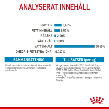 SAMMANSÄTTNING: kött och animaliska biprodukter, oljor och fetter, spannmål, vegetabiliskt proteinextrakt, mineraler, vegetabiliska biprodukter, jäst. ANALYSERAT INNEHÅLL: Protein: 8,4 % - Fettinnehåll: 6,0 % - Råaska: 2,0 % - Växttråd: 1,0 % - Vattenhalt: 78,4 % - Omega-3-fettsyra (DHA): 0,047 % - Vitamin E: 160mg/kg - Vitamin C: 95mg/kg. TILLSATSER (per kg): Näringstillsatser: Vitamin D3: 150IE, Järn (3b103): 6mg, Jod (3b202): 0,34mg, Koppar (3b405, 3b406): 2,7mg, Mangan (3b502, 3b503, 3b504): 1,9mg, Zink (3b603, 3b605, 3b606): 19mg - Tekniska tillsatser: Clinoptilolit av sedimentärt ursprung: 2g. UTFODRINGSANVISNING: se tabell. Fabrikens registrerings- och partinummer, bäst före datum: se förpackning. Förvaras torrt och svalt.