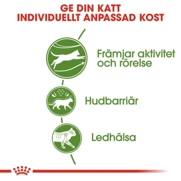 Royal Canin Outdoor Cat är ett näringsrikt torrfoder för aktiva katter som gillar att vara utomhus. Det har ett högt energi- och kaloriinnehåll för att säkerställa att det uppfyller näringskraven för utekatter med ett aktivt liv. Fodret innehåller även en speciell sammansättning av näringsämnen, antioxidanter som bidrar till att stödja din katts immunförsvar, och också prebiotika som främjar tarmfloran för optimal tarmhälsa. Till stöd för att bidra till fysiska aktiviteter utomhus, som att springa, hoppa och klättra, innehåller ROYAL CANIN Outdoor en kombination av Omega-3-fettsyror (EPA och DHA) för att stödja kattens ledhälsa. 10 kg.