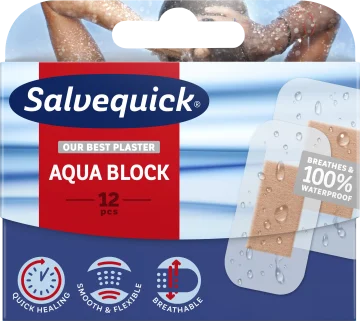 Salvequick Aqua Block är ett helt vattentätt plåster med hög andningsförmåga, speciellt framtagen för att ge optimala förhållanden för en snabb sårläkning med minskad risk för ärrbildning. Avancerat och extra tunt genomskinligt material som är mjukt och följsamt. 12st.