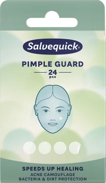 Salvequick Pimple Guard är ett plåster med hydrokolloid som hjälper till att förkorta finnperioden. Plåstret är effektivt mot att dölja och skydda akne och finnar från smuts, bakterier och smink och är vattentätt och andningsbart. Salvequick Pimple Guard är CE märkt och klassad som medicinteknisk produkt Klass 1. 24 st.
