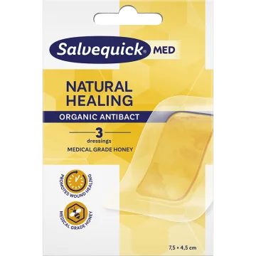SalvequickMED Natural Healing är ett förband med medicinsk honung för användning vid akuta och kroniska sår. Natural Healing främjar och stimulerar sårläkning, hjälper till att förebygga infektioner och minska risken för ärrbildning. Hydrogel sårdynan innehåller honung av medicinsk kvalitet. Förbandet har även en kylande och lugnande effekt. Dessa sårförband är sterila och genomskinliga med en baksida av polyuretanfilm med en självhäftande kant. Kan användas för de flesta typer av sår, inklusive infekterade sår, skärsår, skrubbsår, brännskador av första och andra graden (undantag: brännskador av tredje graden). 3st.