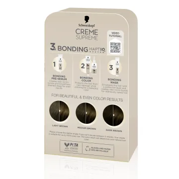 Schwarzkopf Creme Supreme 5-0 Natural Brown är en hårfärg med 3x bonding HaptIQ System som förbereder, skyddar och stärker håret för ett jämnt färgresultat med 100% gråhårstäckning. Det vårdande pre-serumet förbereder håret innan färgning, skapar nya mikrobindningar och bidrar till ett jämnt färgresultat. Bonding color skyddar håret från skador under färgningen och bonding hårkur skapar ett skyddande lager och vårdar håret.