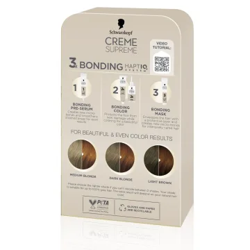 Schwarzkopf Creme Supreme 7-7 Copper Dark Blonde är en hårfärg med 3x bonding HaptIQ System som förbereder, skyddar och stärker håret för ett jämnt färgresultat med 50% gråhårstäckning. Det vårdande pre-serumet förbereder håret innan färgning, skapar nya mikrobindningar och bidrar till ett jämnt färgresultat. Bonding color skyddar håret från skador under färgningen och bonding hårkur skapar ett skyddande lager och vårdar håret.