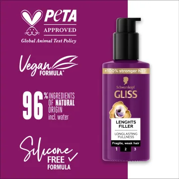 Schwarzkopf Gliss Full Hair Wonder Length Filler är ett stärkande hårserum för tunt hår. Serumet kombinerar HAPTIQ-systemet och koffein som hjälper till att ge en känsla av fylligare hår. Ingredienserna hjälper till att förhindra att håret bryts av samt stärker längderna och hårets struktur. Med en härlig doft av mysk. 96% av ingredienserna är av naturligt ursprung. Silikonfri. Vegansk. 100 ml.
