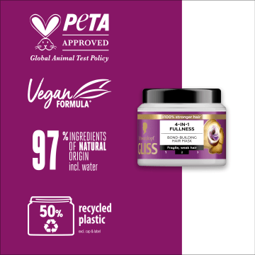 Schwarzkopf Gliss Full Hair Wonder Mask är en stärkande hårinpackning för tunt hår. Hårmasken kombinerar HAPTIQ-systemet och koffein som hjälper till att ge en fylligare känsla. HAPTIQ-systemet skapar mikrobindningar och hjälper till att stärka hårets struktur. Med en härlig doft av mysk. Med 97% ingredienser av naturligt ursprung. Vegansk. 400 ml.
