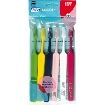 TePe Select Extra soft är en extra mjuk och tät tandborste. Det lilla avsmalnande borsthuvudet förenklar och förbättrar rengöringen av de bakre tänderna. Byt tandborste ofta för bästa effektivitet och hygien. Greppvänlig och gjord i hållbart material. För vuxna. Levereras i osorterade färger. 6 st.