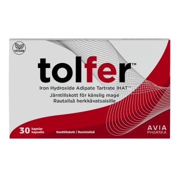 Tolfer Järn är ett kosttillskott som innehåller IHAT-järn, som efterliknar ferritin från kosten utan att irritera magen eller påverka tarmens mikrobiella balans. IHAT-järnet absorberas effektivt i kroppen utan hjälp av C-vitamin. Järn bidrar till normal bildning av röda blodkroppar och hemoglobin. Kapslarna är små och lätta att svälja. Produkten är fri från gluten, mjölk och laktos och passar även veganer. För vuxna över 18 år. 30 st.