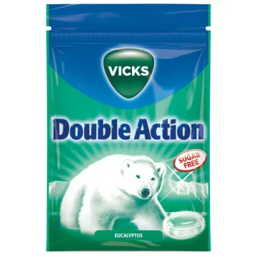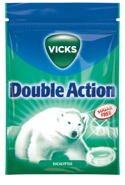 Vicks Double Action Sugar Free är halstabletter med eukalyptussmak. De ger en uppfriskande känsla i munnen. Halstabletterna är sötade med sötningsmedel. De är individuellt paketerade. Överdriven konsumtion kan ha laxerande effekt. 72 g.