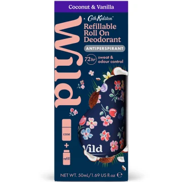 Wild Deo Roll On Cath Kidston Marble Case Coconut Vanilla är en roll-on antiperspirant i en smart lösning. Fodralet förvaras och fylls på med en plastfri refill när den är tom. Deodoranten innehåller vårdande och effektiva ingredienser som ger skydd mot oönskad lukt och håller torrt. Lämnar inga vita märken och har en formula som torkar snabbt. Söt doft med exotisk blandning av kokosolja, kakao och sheasmör. Refillen kan återvinnas via pappersåtervinningen. Vegansk.