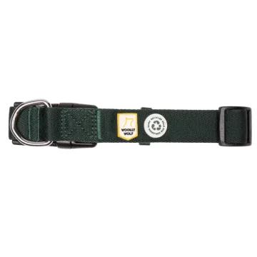 Woolly Wolf Halsband Evergreen är ett starkt och bekvämt hundhalsband i mjuk nylon och en härligt skogsgrön färg. Lätt och smidig modell som passar perfekt när du vill att hunden går nära dig på promenader eller vid lydnadsträning. Med klickspänne och koppelring. Tillverkat av polyester från återvunna PET-flaskor. Finns i flera storlekar.